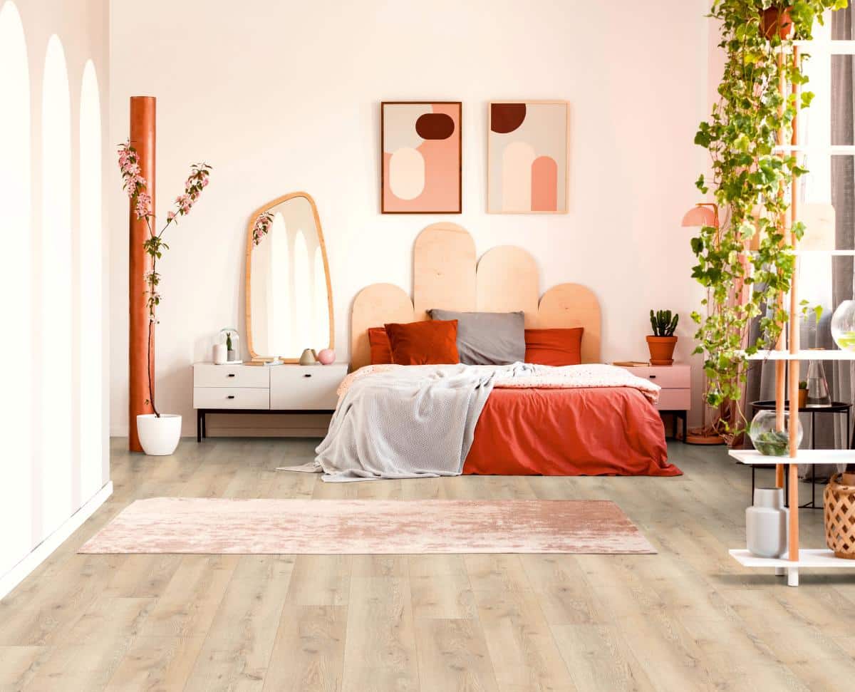 Lyst laminatgulv i naturligt egetræslook – D40772 Mountain Oak Sand fra Mammut Plus. Ekstra brede planker, mat finish, ridsefast overflade og nem lægning med 5G-kliksystem. Egnet til gulvvarme.
