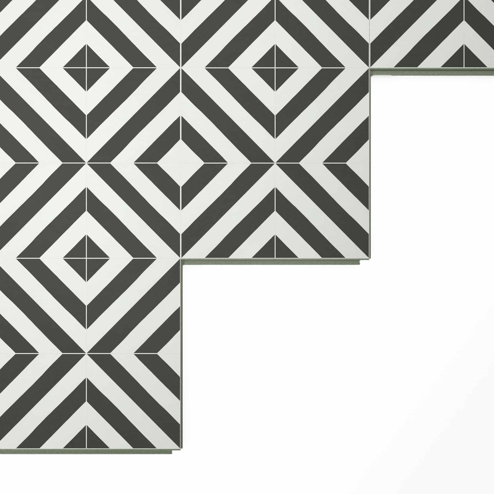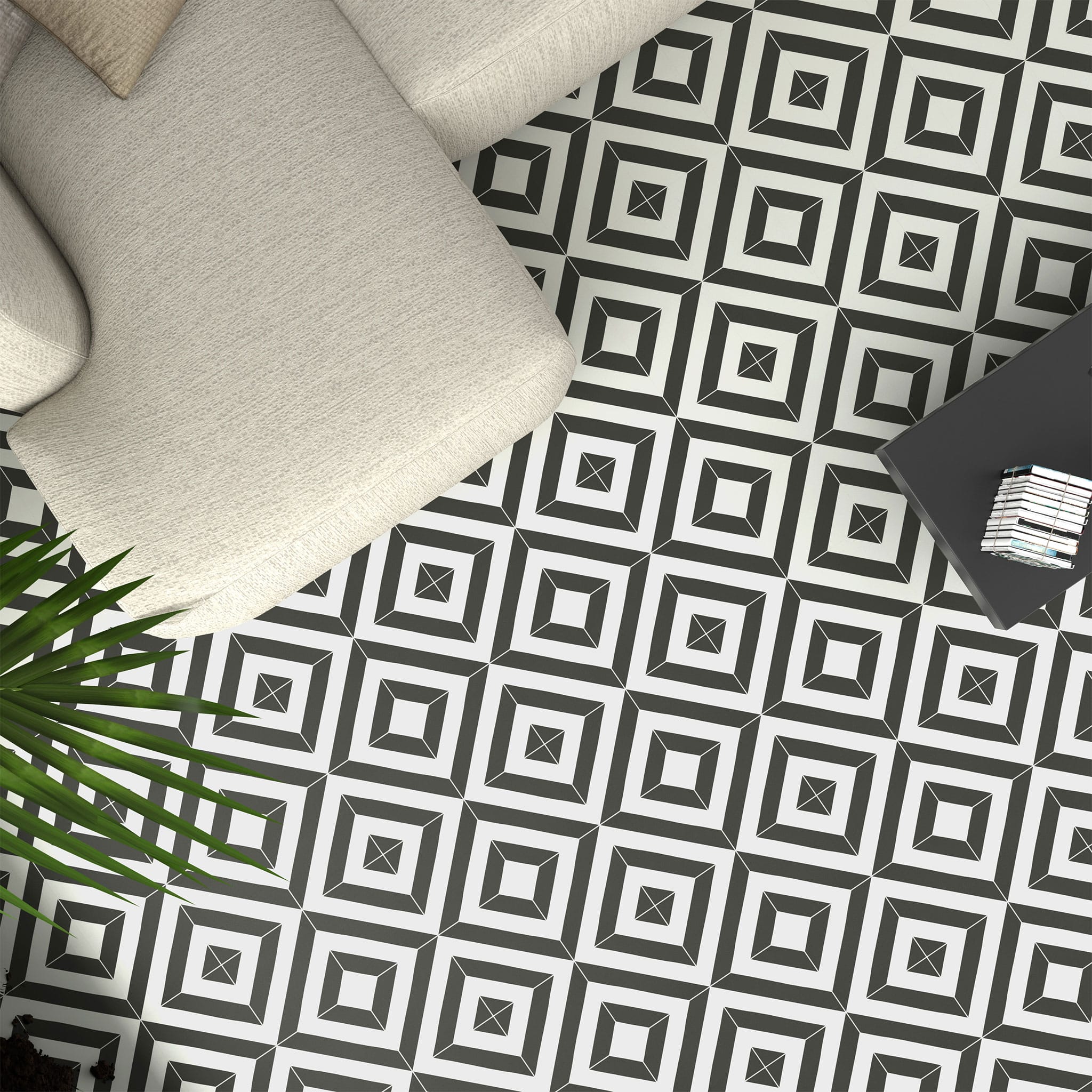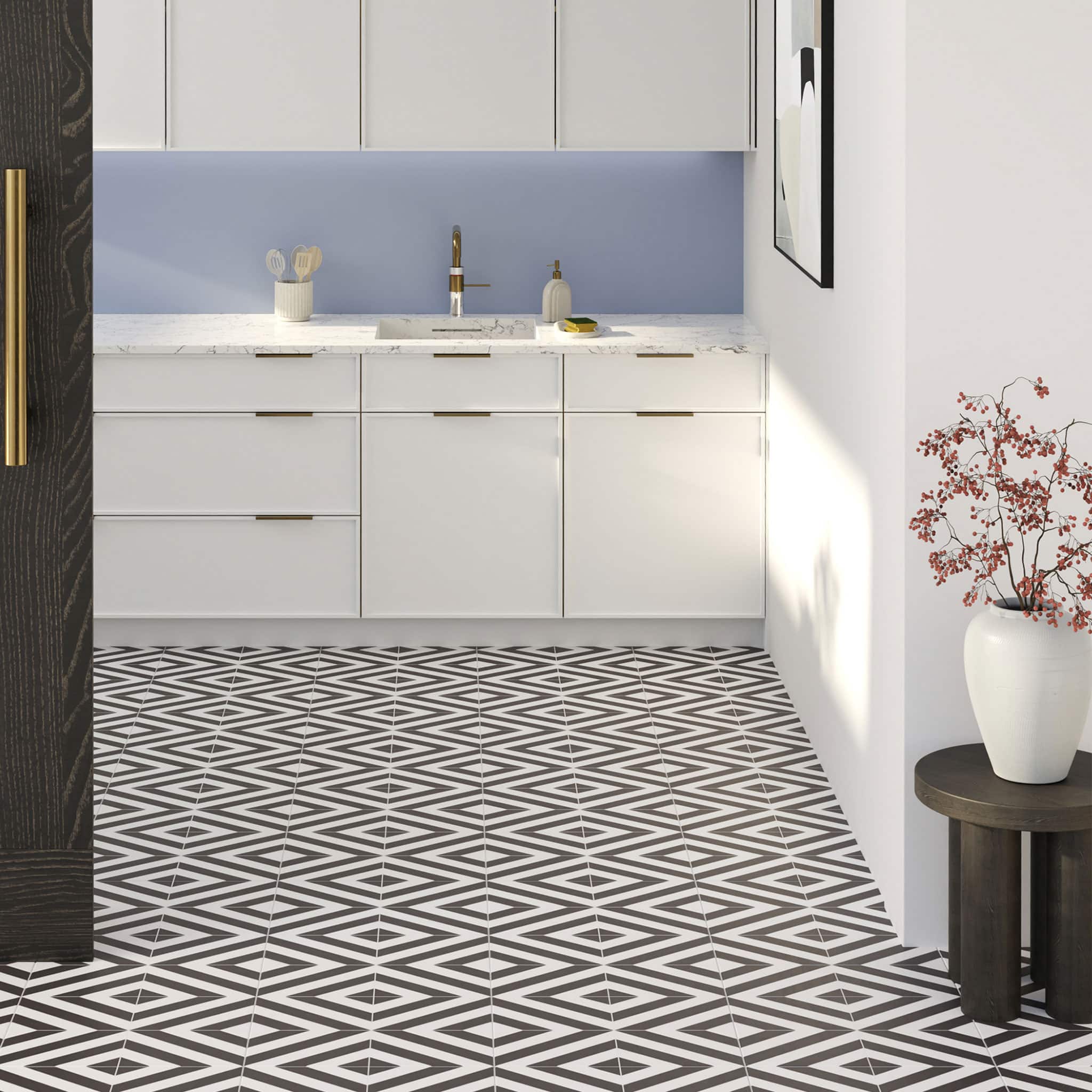 Elvik BLACK & WHITE laminatgulv bringer et tidløst og stilfuldt retro-touch til ethvert rum. De kontrastfulde sorte og hvide geometriske mønstre skaber et dekorativt element, som straks giver karakter og personlighed, uden at overmande rummet.