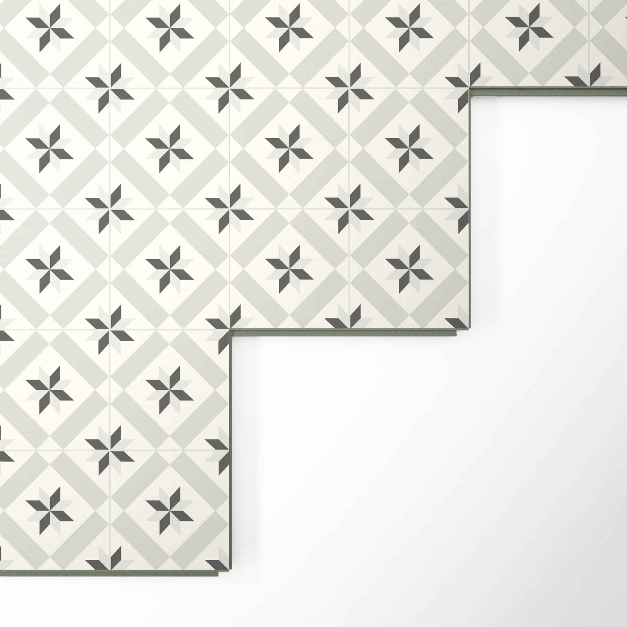 Elvik Elittra laminatgulv kombinerer tidløse geometriske mønstre med et moderne sten- og keramisk look. Inspireret af de klassiske hydrauliske gulve, bringer dette gulv et dekorativt element, som står stærkt alene og skaber et visuelt fokus i ethvert rum.