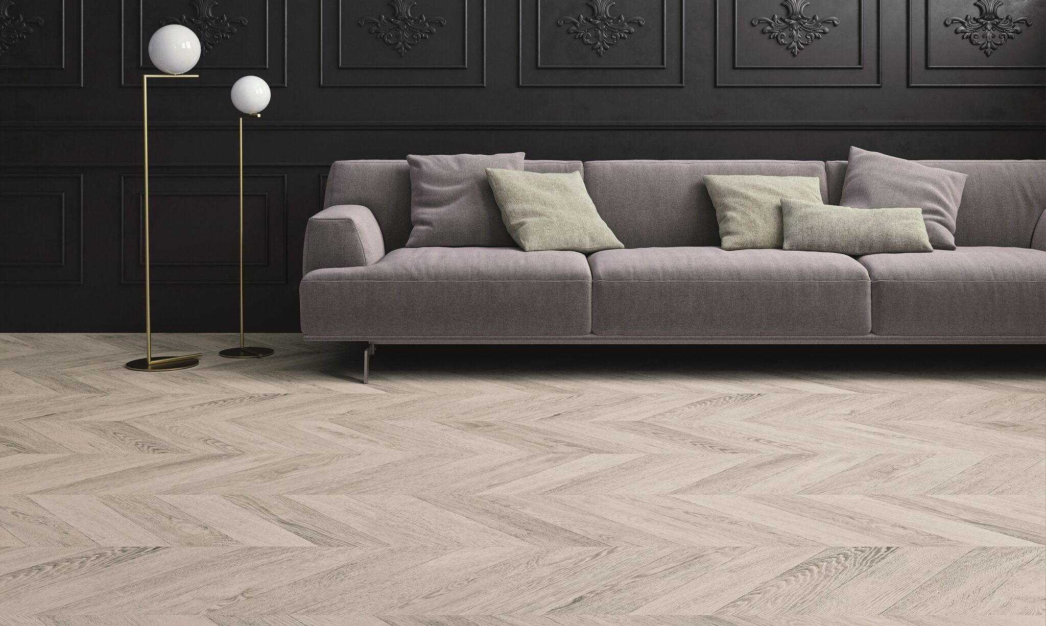 Forside / Alle produkter / Laminatgulve / Mønster Laminat / ELVIK – Light Grey Chevron Laminatgulv – Heritage Collection