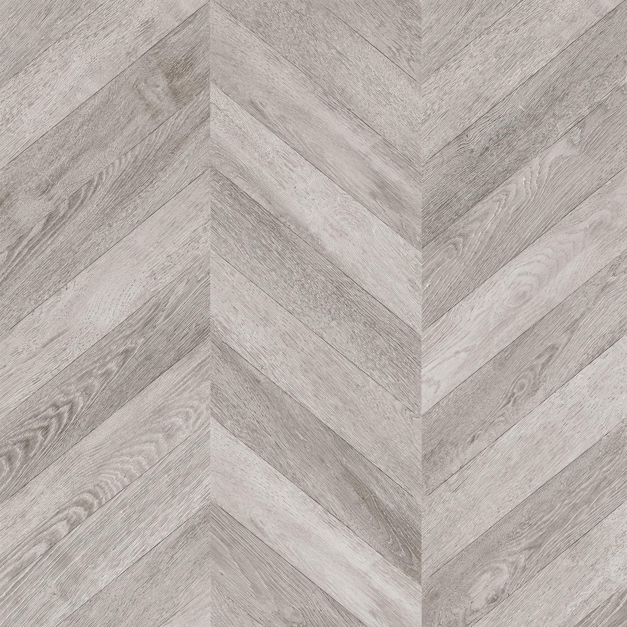 Light Grey Chevron har et lyst, elegant chevronmønster med ultramat finish og synkroniseret prægning. Velegnet til køkken, badeværelse og gulvvarme, med nem installation.