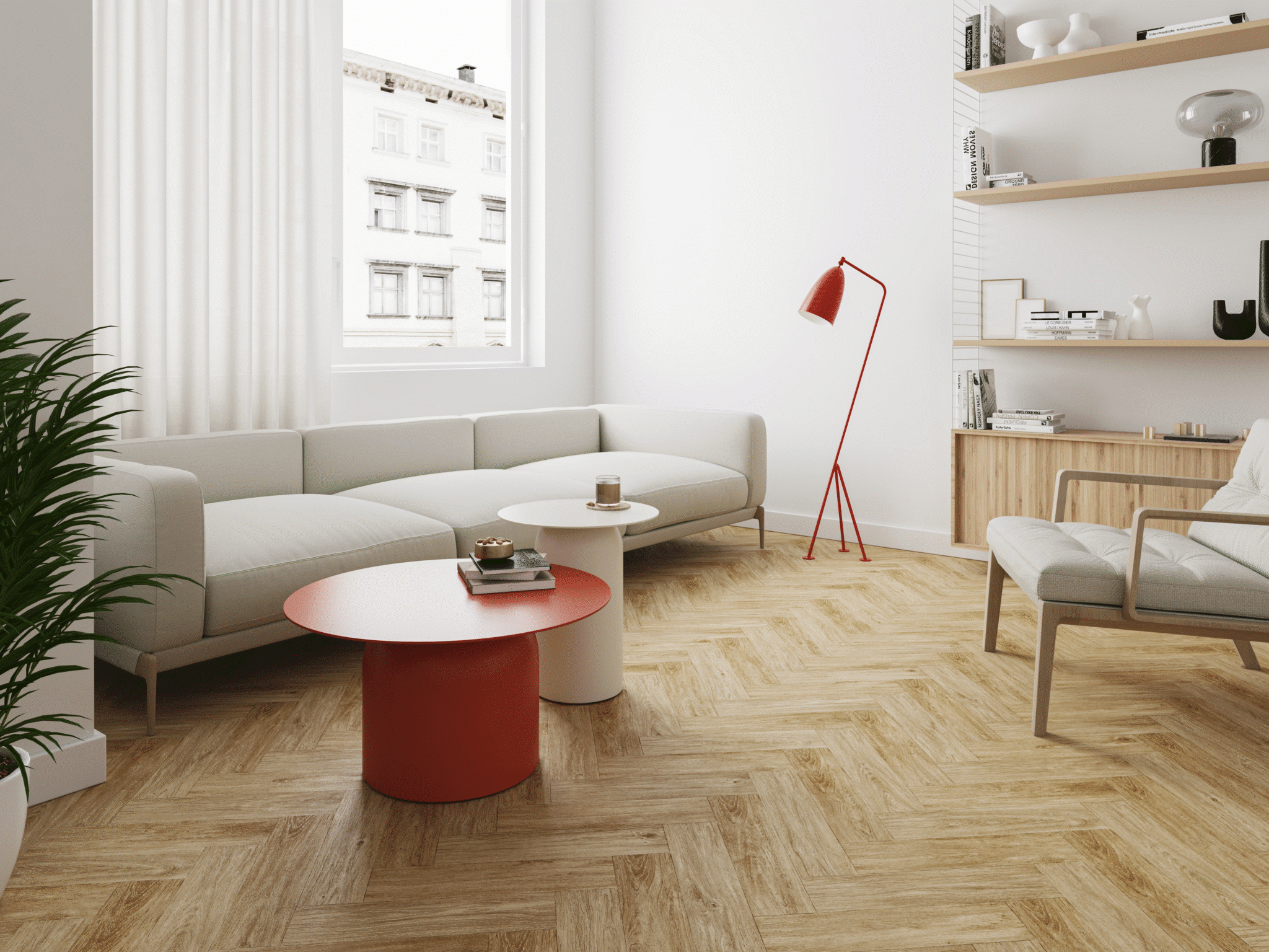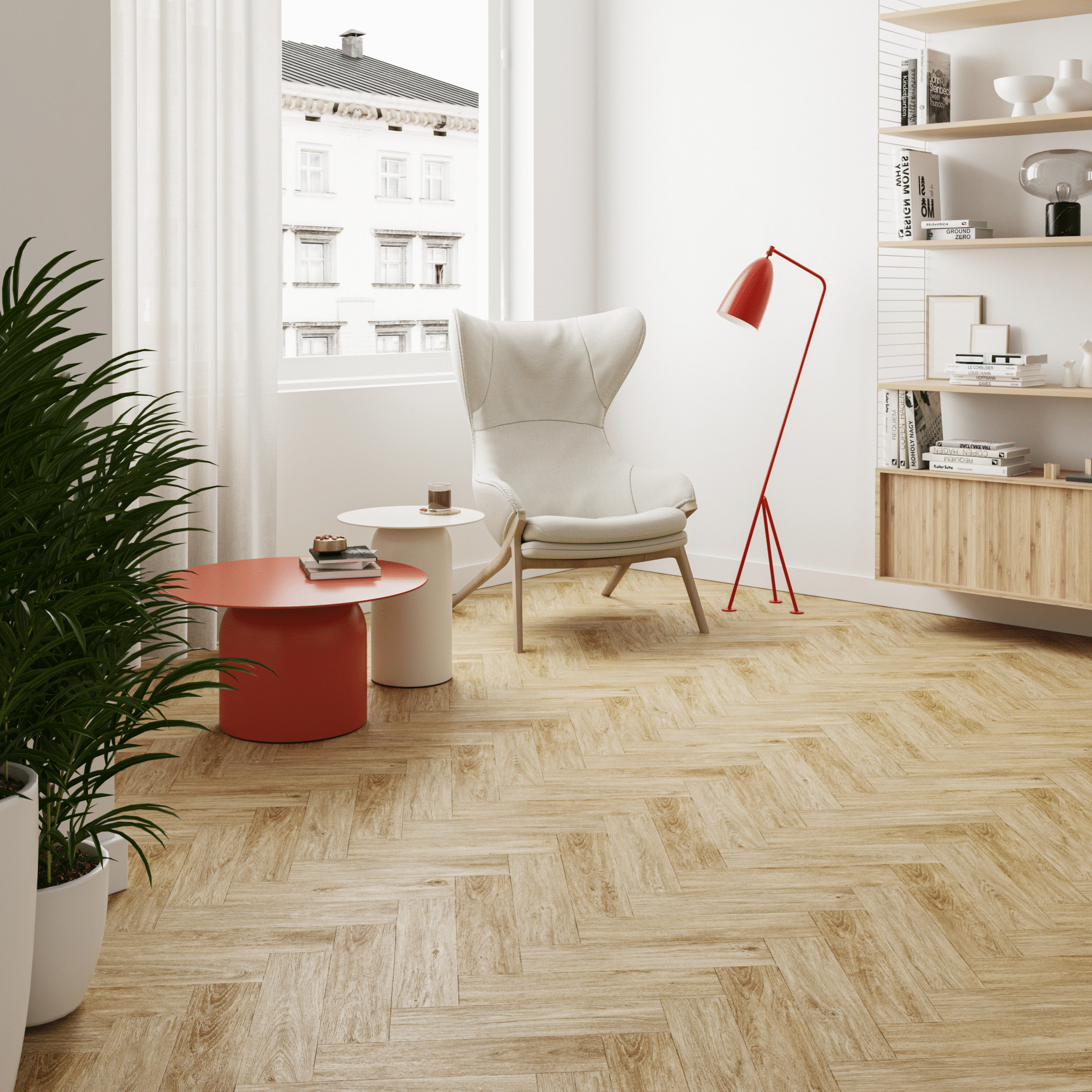 Narbona Herringbone byder på naturlige, varme toner i et klassisk sildebenmønster med usynlig samling mellem planker. Ultramat, synkroniseret overflade og velegnet til både køkken, bad og gulvvarme. Nem montering.