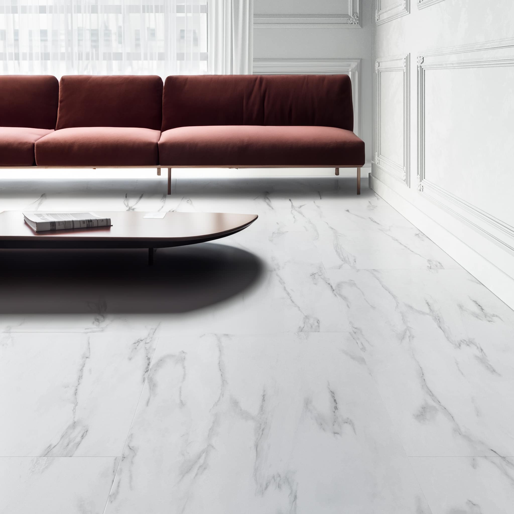 ELVIK Statuario gengiver marmorens ægte udseende med stenrelief og smukke årer. De store planker på 1182 × 601 mm giver et eksklusivt og elegant udtryk, ideelt til både bolig og erhverv.