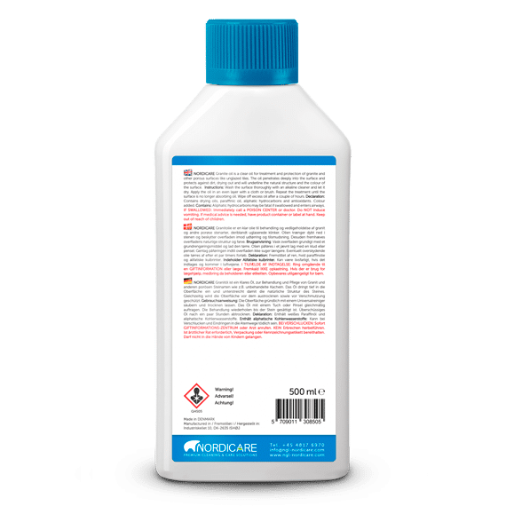 GRANITE OIL fra Nordicare er en effektiv og klar olie, der er udviklet til behandling, beskyttelse og vedligeholdelse af granit samt andre porøse overflader – herunder uglaserede keramiske fliser. Olien trænger dybt ned i materialet og danner en beskyttende barriere, som reducerer risikoen for udtørring, pletter og snavs.