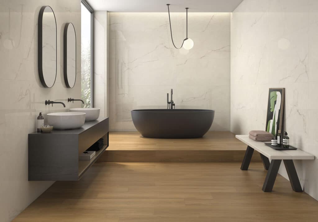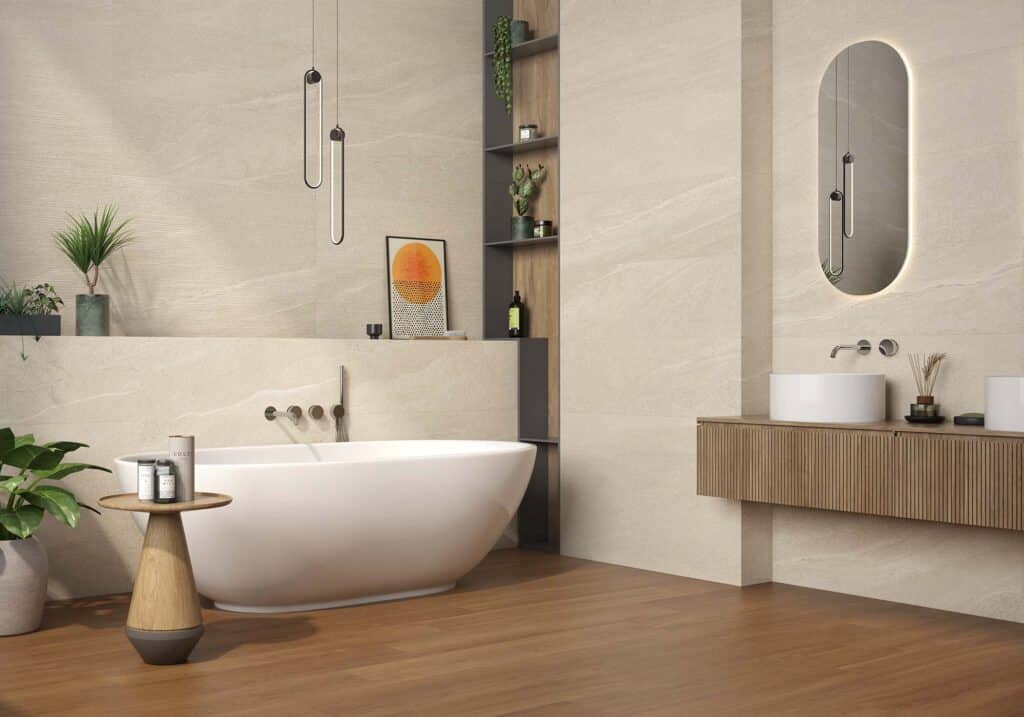 Fliserne fås i tre varme og naturlige farver: Arce, som er lys og luftig, Nogal, et mellemtonet trælook, og Cerezo, en varm og mørk nuance, der tilføjer dybde og karakter til rummet. Den gennemførte struktur og mat overflade fremhæver træets naturlige årestruktur og giver samtidig et elegant, moderne udtryk.