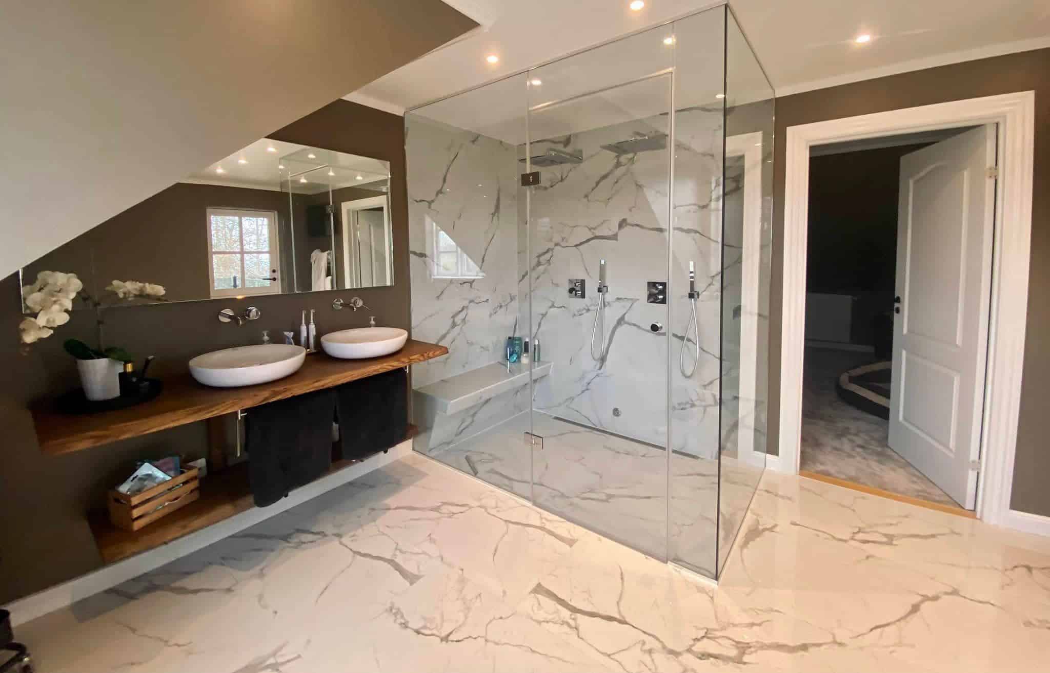 Norwell Hvid fliser fremhæver rummets lys og giver en eksklusiv marmorfinish, samtidig med at porcelænets praktiske egenskaber sikrer minimal rengøring og maksimal funktionalitet.