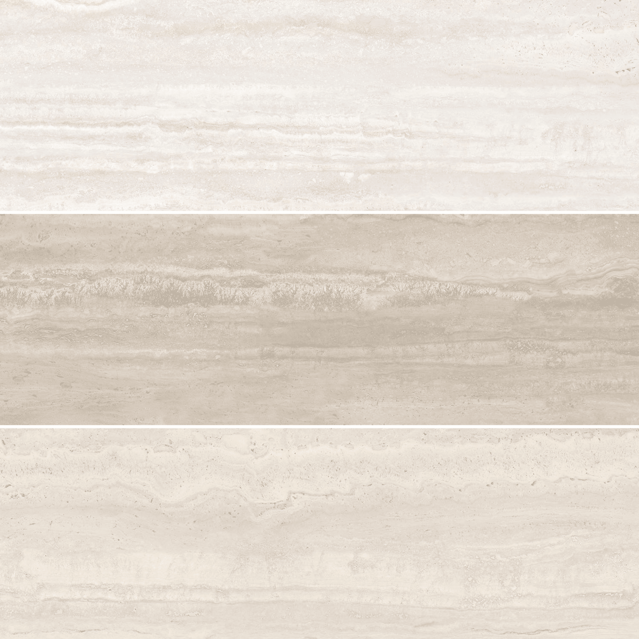 Serien fås i tre lyse og neutrale nuancer: White, Bone og Mud. Farverne er nøje afstemt for at skabe et roligt og harmonisk udtryk, der passer ind i de fleste indretninger. De lyse toner fremhæver travertinens naturlige spil og gør det nemt at kombinere fliserne med både varme og kølige materialer.